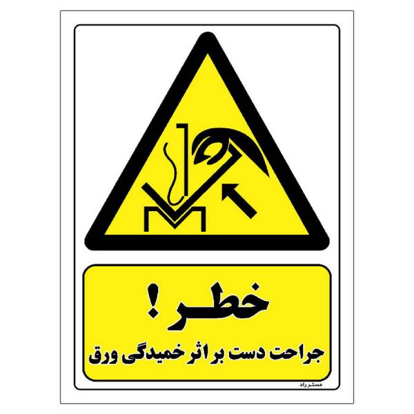 برچسب ایمنی مستر راد طرح خطر جراحت دست بر اثر خمیدگی ورق مدل HSE-OSHA-086