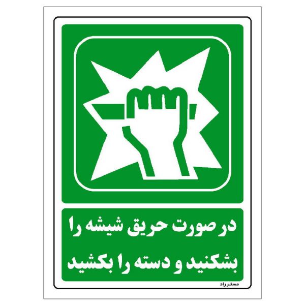 برچسب ایمنی مستر راد طرح در صورت حریق شیشه را بشکنید و دسته را بکشید مدل HSE-OSHA-126